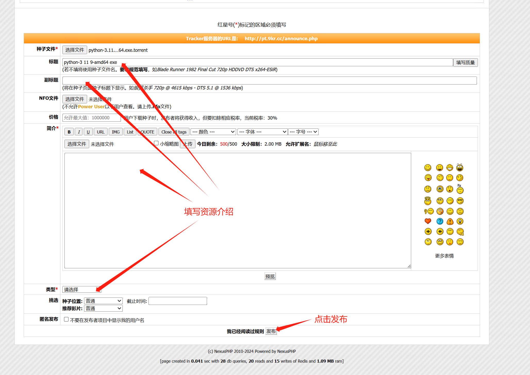 登录刚搭建好的PT站,点击发布,记录下Tracker服务器地址